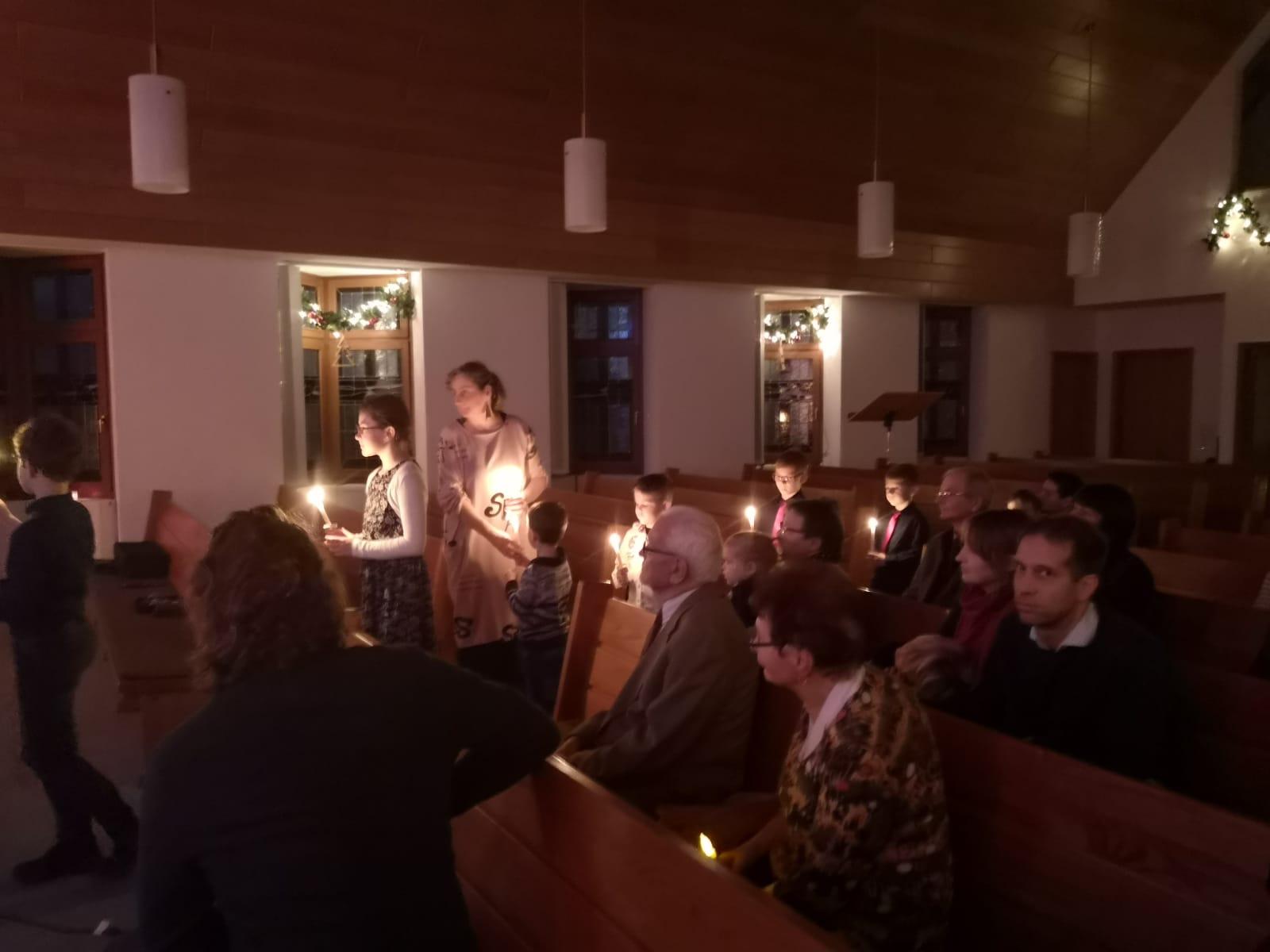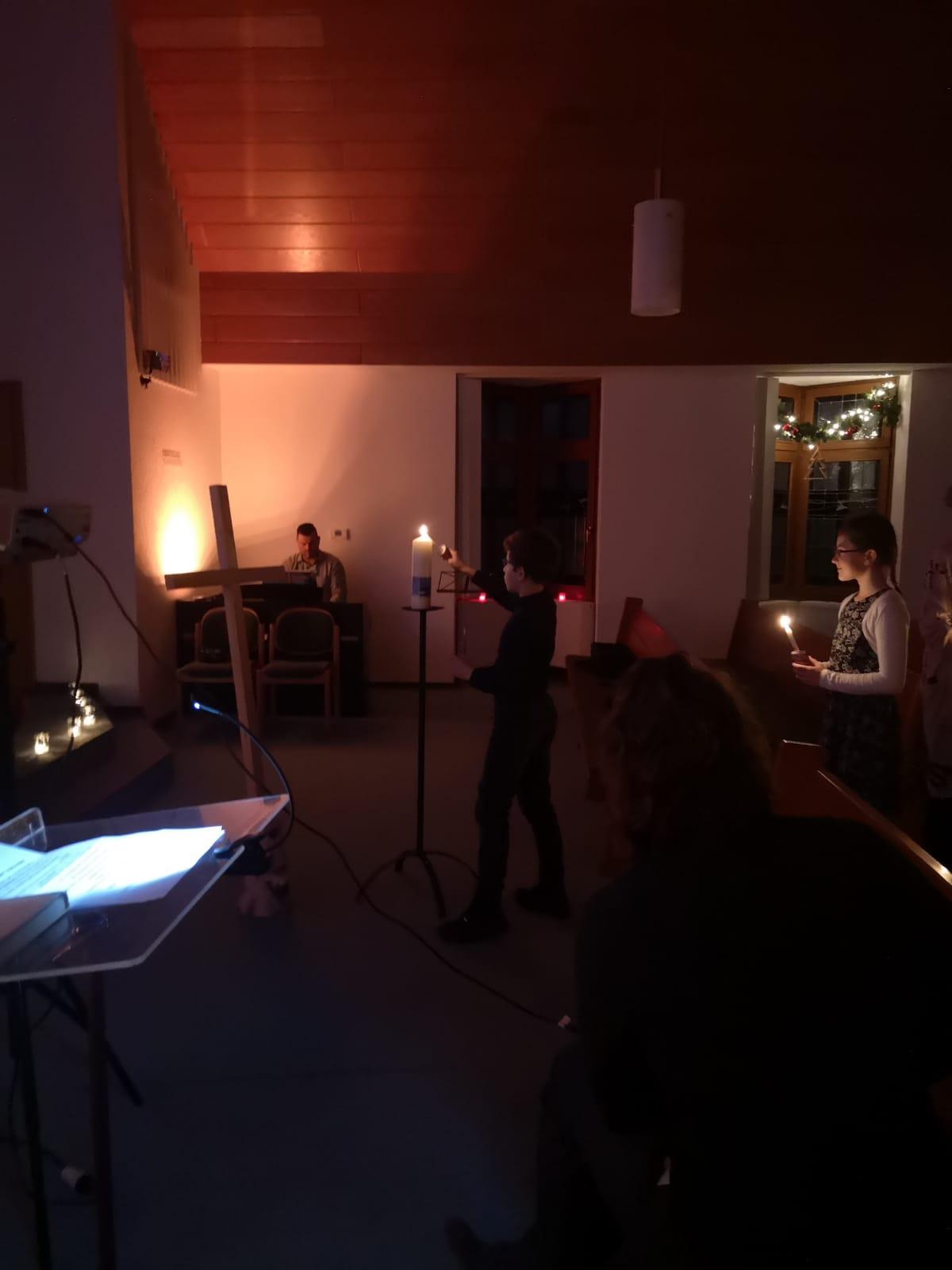 Weihnachtliche Musik, vorgetragen von der Orgel und Geige begrüßten die Besucher der diesjährigen Andacht am Heiligabend. Nach einem kurzen Gebet und einleitenden Worten durch Priester Mike Quirin las ein junger Diakon aus der Weihnachtsgeschichte nach Lukas und richtete seine Gedanken zum Fest an die Versammelten. Anschließend trugen die Kinder bei Klavierbegleitung das Friedenslicht von Bethlehem in die Kirche und entzündeten die große Kerze.